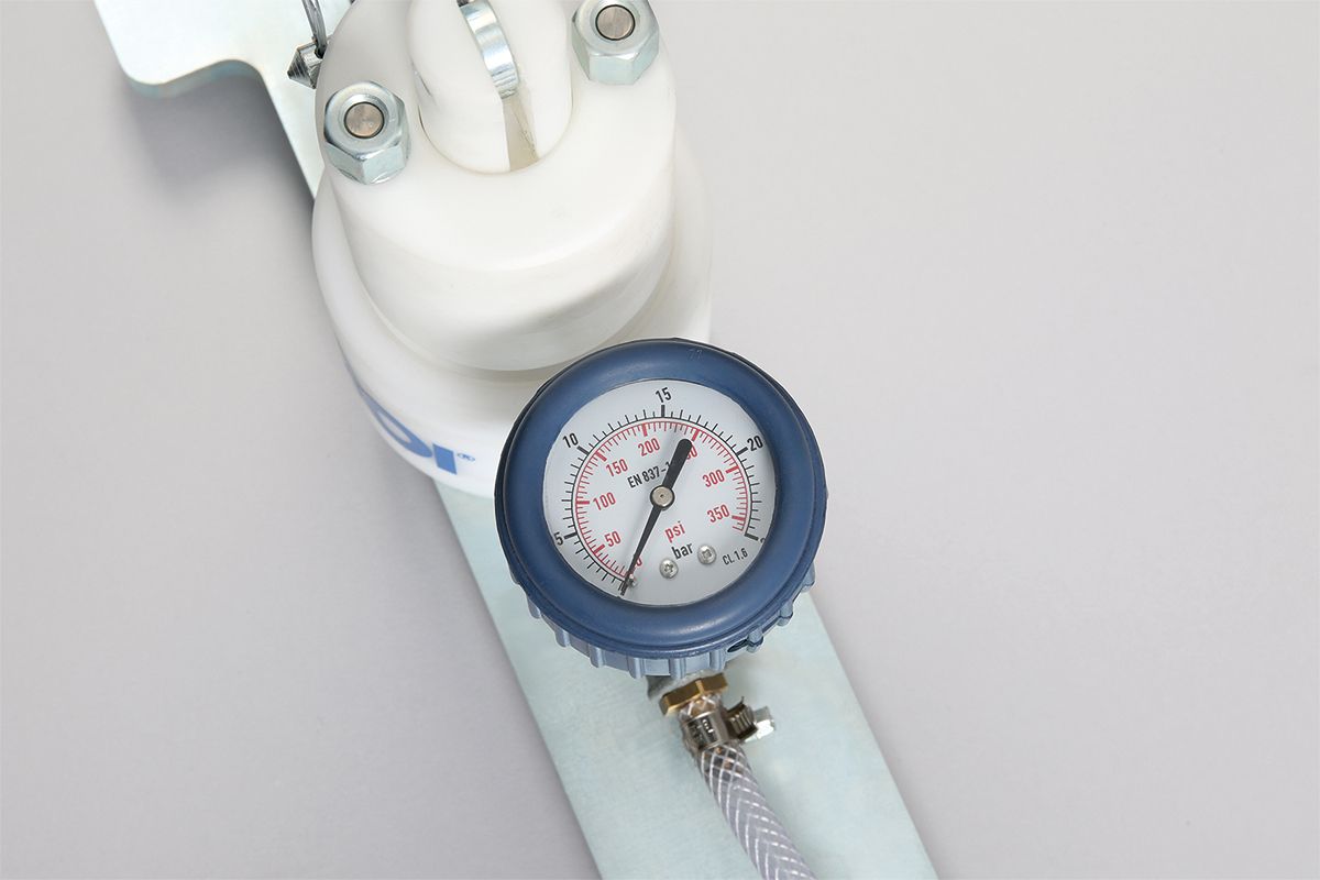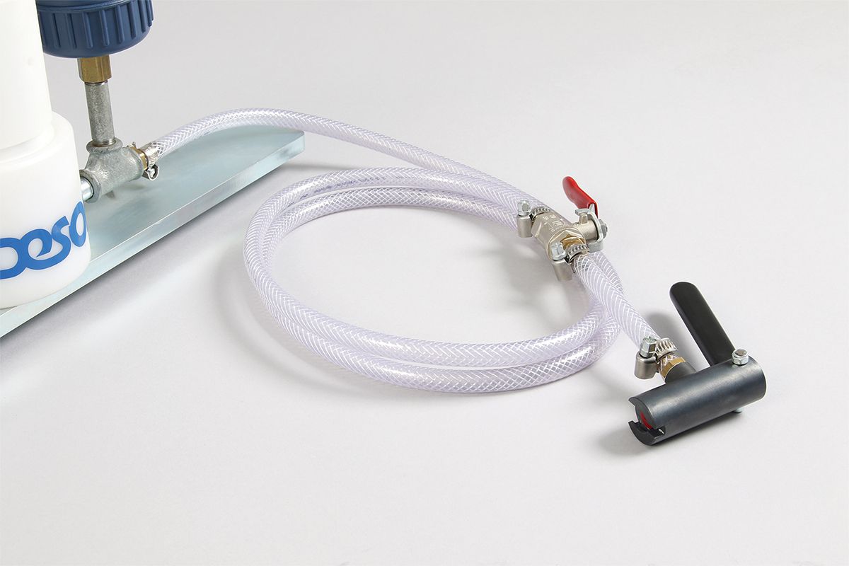 2 litre material container transparent, 2 m fabric hose Ø 6 mm, manometer 0 - 25 bar, LP ball valve R1/4" with DESOI Z-Slider, incl. instruction manual